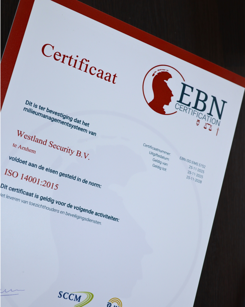 Daarnaast behaalde Westland ISO 14001, de norm voor milieumanagement. In de beveiligingsbranche is dat minder gebruikelijk, maar het past bij hun overtuiging dat ook beveiligingsorganisaties verantwoordelijkheid dragen voor duurzaam ondernemen.